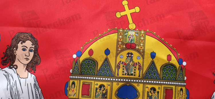 تاج بزرگ بالای نشان، تاج قدیس استفان اولین پادشاه مجارستان و بنیانگذار مسیحیت در مجارستان در سال 1000 یا 1001 میلادی است.