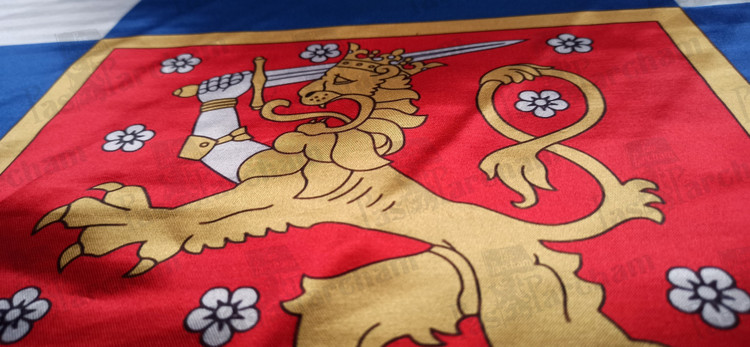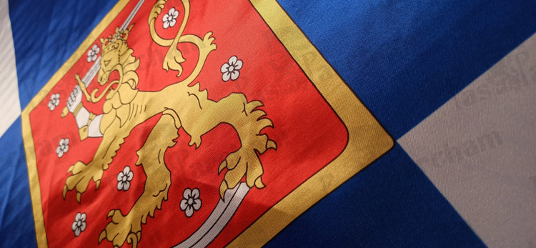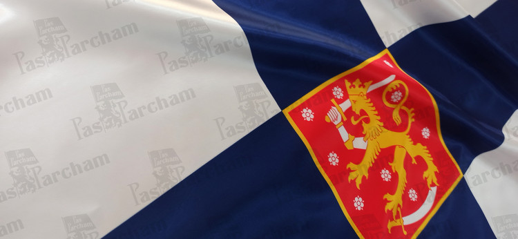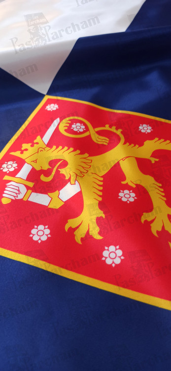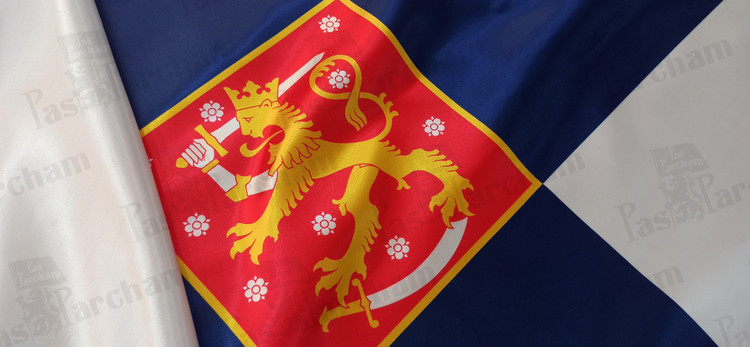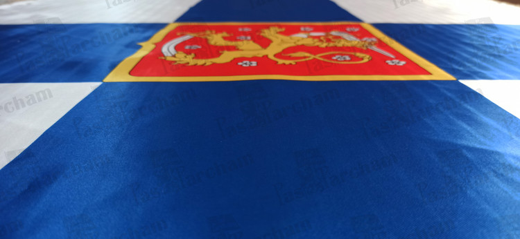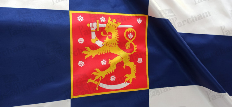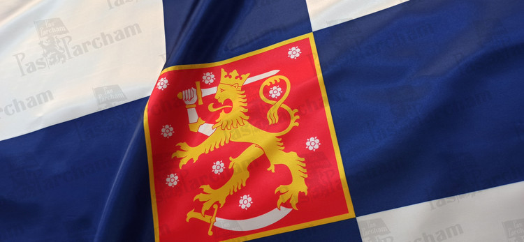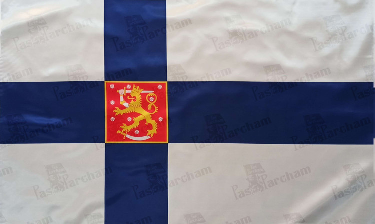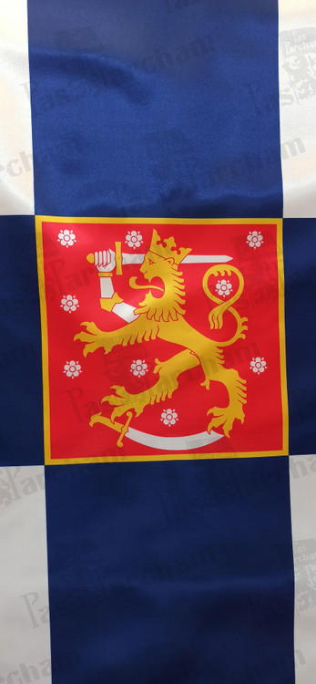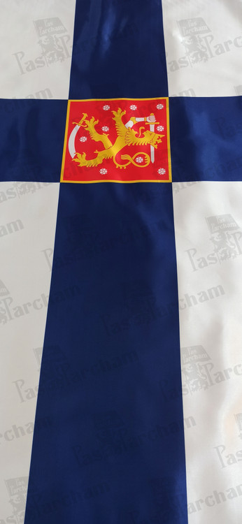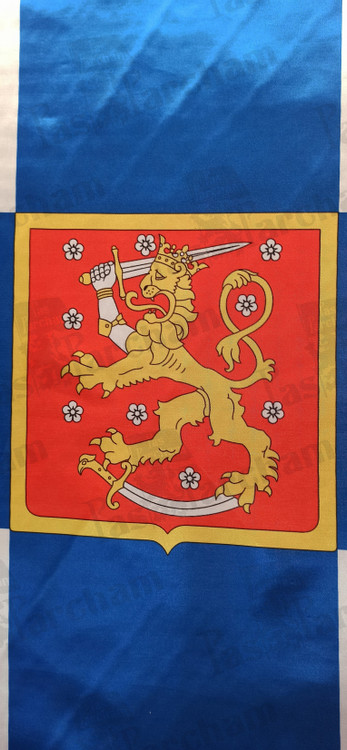توضیحات: همچون پرچم سوئد و نروژ، به تقلید از پرچم دانمارک از صلیبی نوردیک به نشانه پیشینه مسیحیت این کشور و شیری شمشیر به دست در حال پامال کردن یک شمشیر روسی تشکیل شده است. (استفاده از شیر در بسیاری از کشور های اروپایی رواج داشته و از قرن 13 پس از اینکه فنلاند تحت سلطه سوئد درآمد، این نماد راه خود را به کشور فنلاند باز کرد)