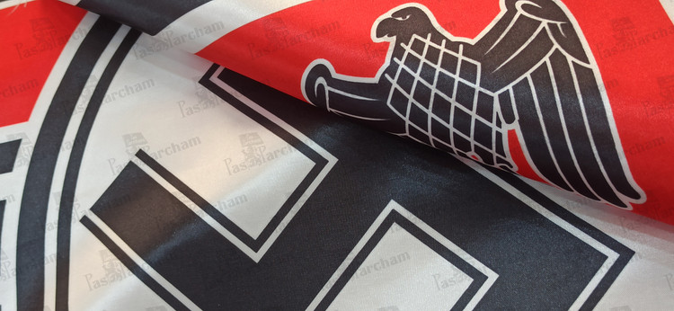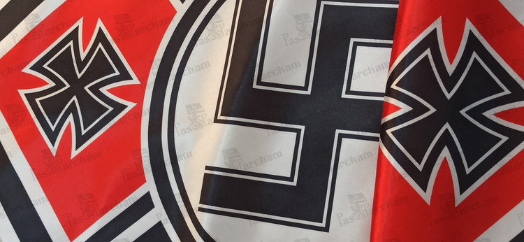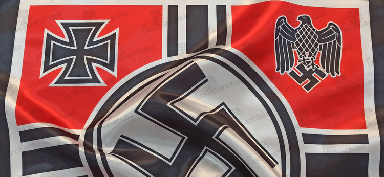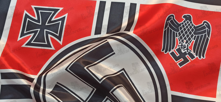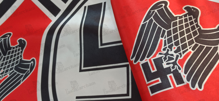 توضیحات: متشکل از سواستیکایی در میان پرچم که توسط 2 عقاب آلمانی و 2 صلیب آهنین (از نشان های رزمی آلمانی) احاطه شده.